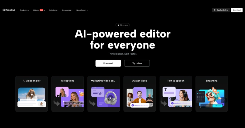 CapCutSocial media creatorsWeb, iOS, Android, Win/MacAI auto-captions, trending templates, background remover, stock musicLimited advanced timeline controls