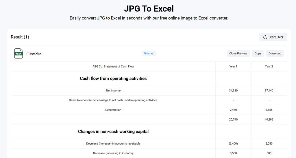 On the other side, a JPG to Excel converter allows you to automatically transform JPG images into Excel within a matter of seconds. Plus, it will ensure that all of your data is accurately converted into editable tables in Excel.